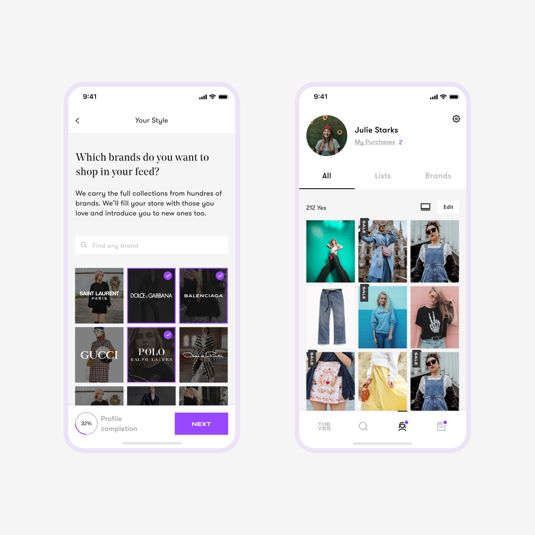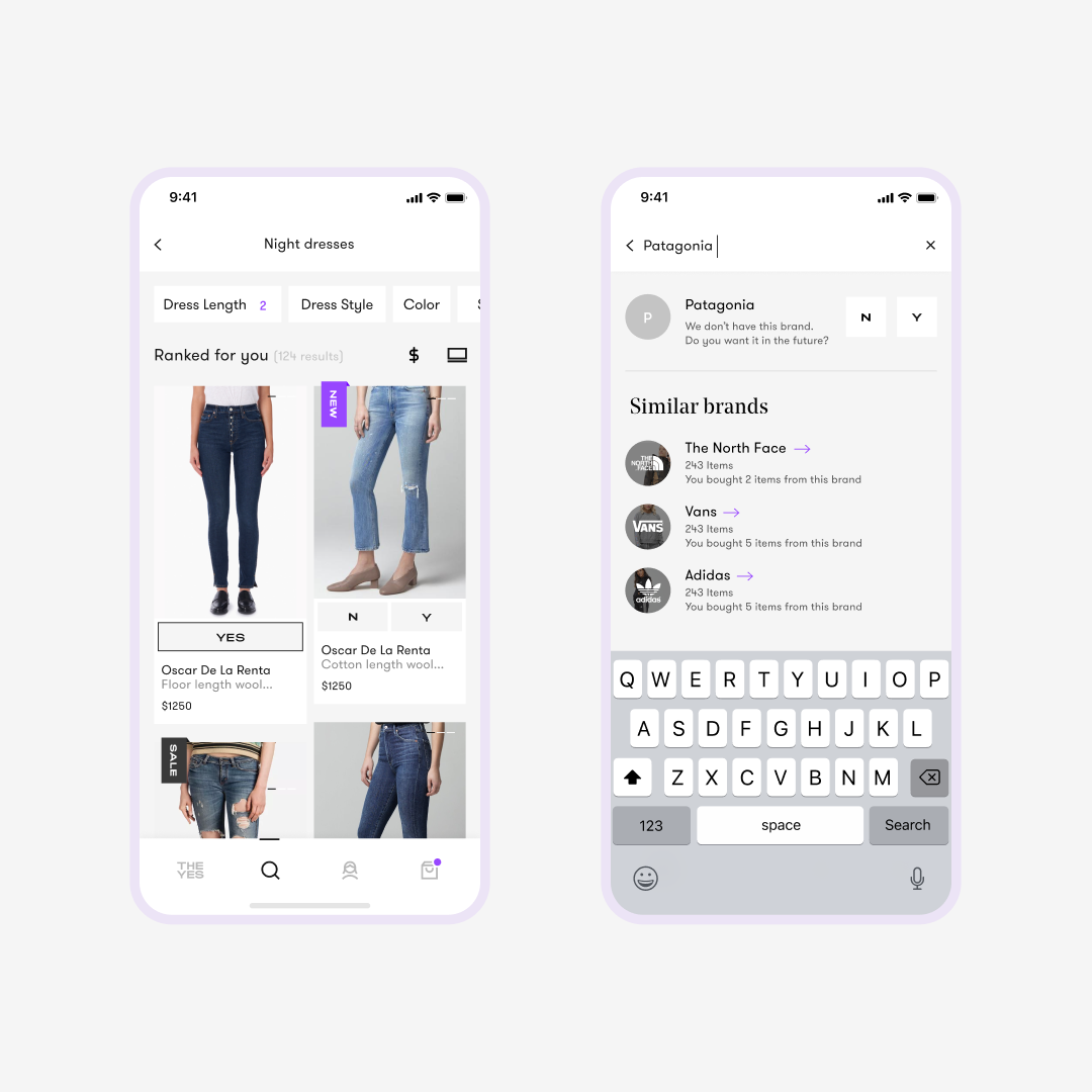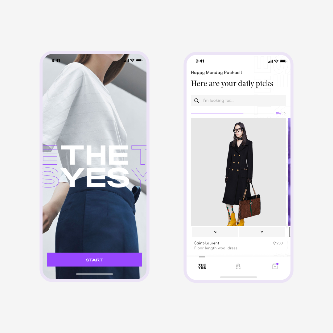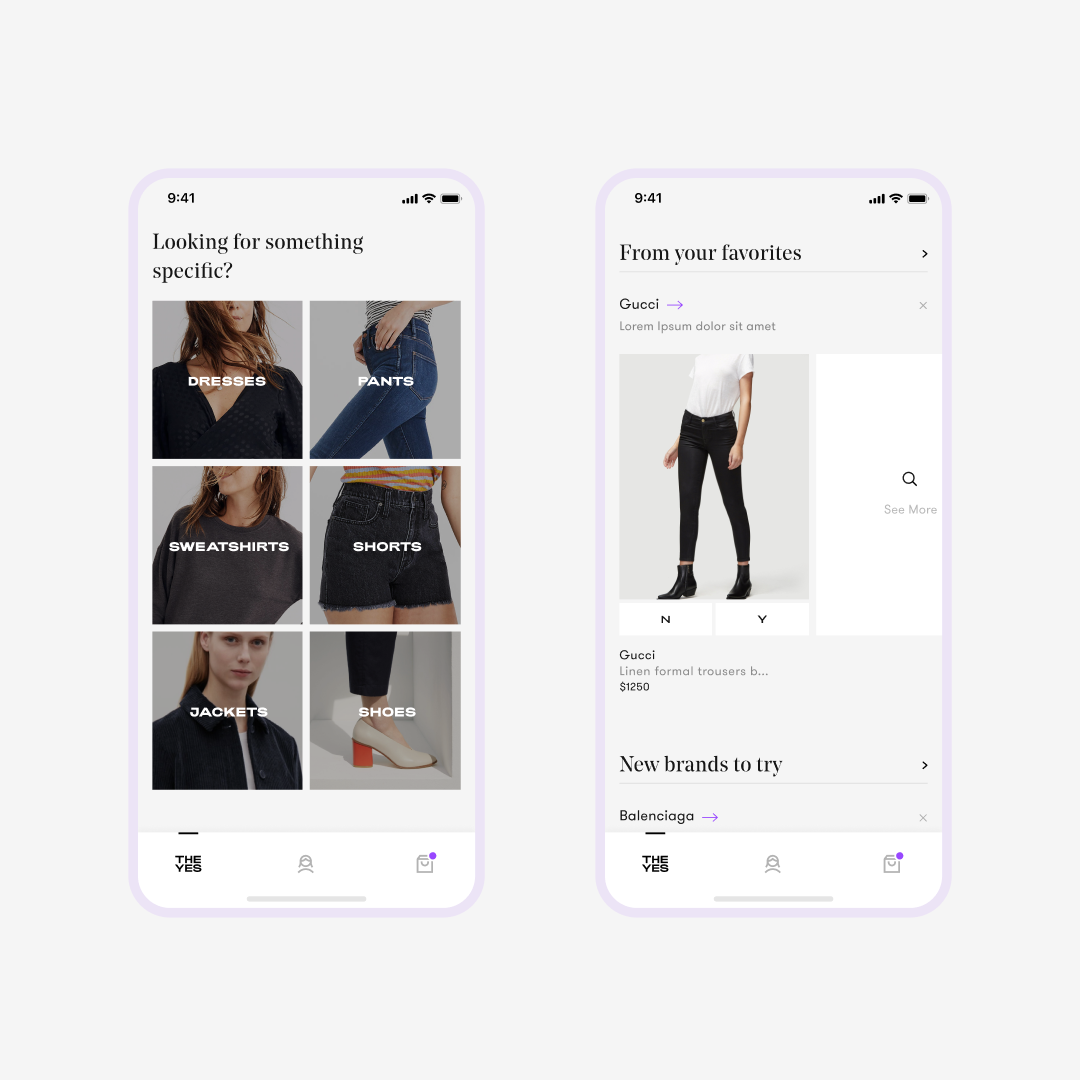 Brand / Mobile App DesignThe Yes app uses a simple approach to create a personalized online shopping experience. It starts with a quiz to learn a person's retail preferences and offers items from their favorite brands.